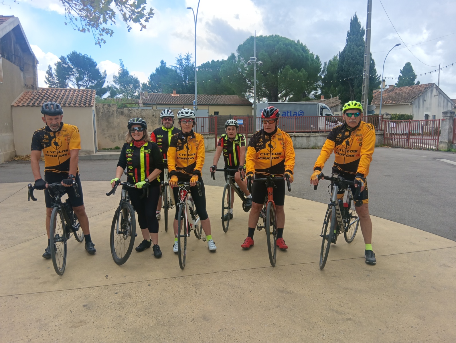 Nous repartons vers la route d'Apt ,puis l'hippodrome pour atteindre l'Isle sur Sorgues avec maintenant le vent dans le dos , nous prenons la voie cyclable jusqu'à Velleron , puis toujours sur la piste cyclable direction Pernes , Carpentras pour atteindre Serres ou un petit ravito nous attend (saucisson , pizza , tarte aux pommes ) qui restent de la réunion sur les séjours du vendredi soir.